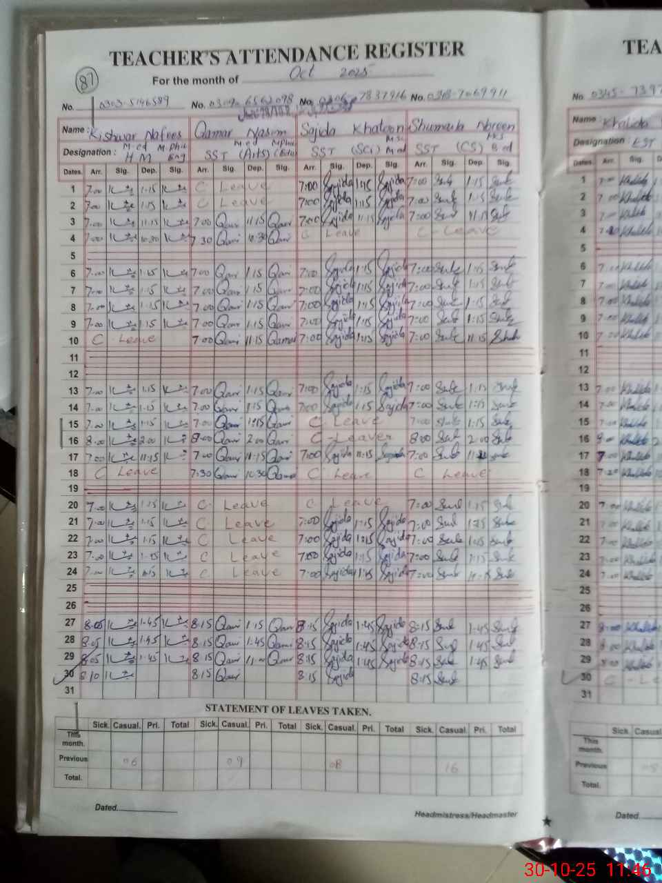 | CNIC | Full Name | Designation | R/C | Absence During Last Calender Month |