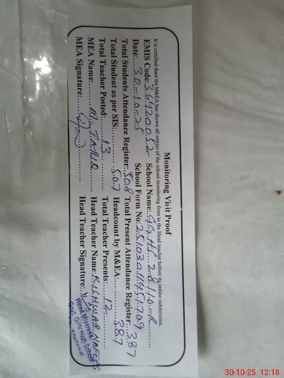 | Attendance Register | Head Teacher | MEA with School | Visit Proof |