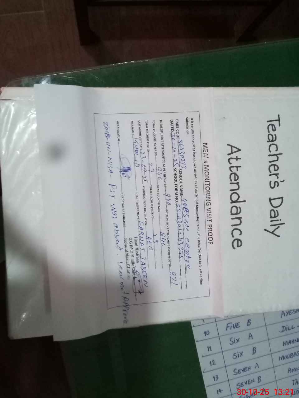 | Attendance Register | Head Teacher | MEA with School | Visit Proof |