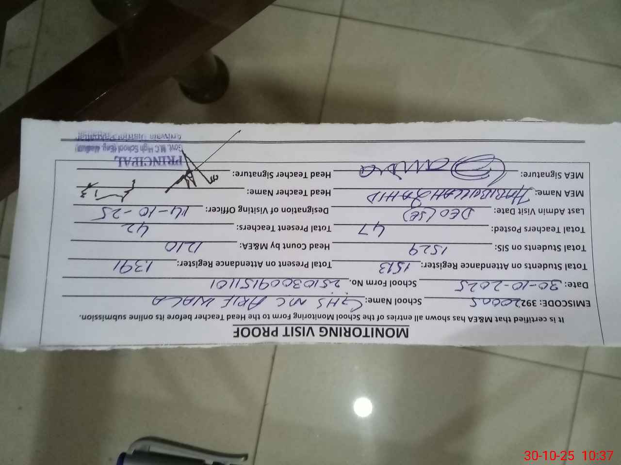 | Certified that this School was Inspected by the Undersigned MEA/DMO Today and the Information Stated Above is as Per Record. | |||||