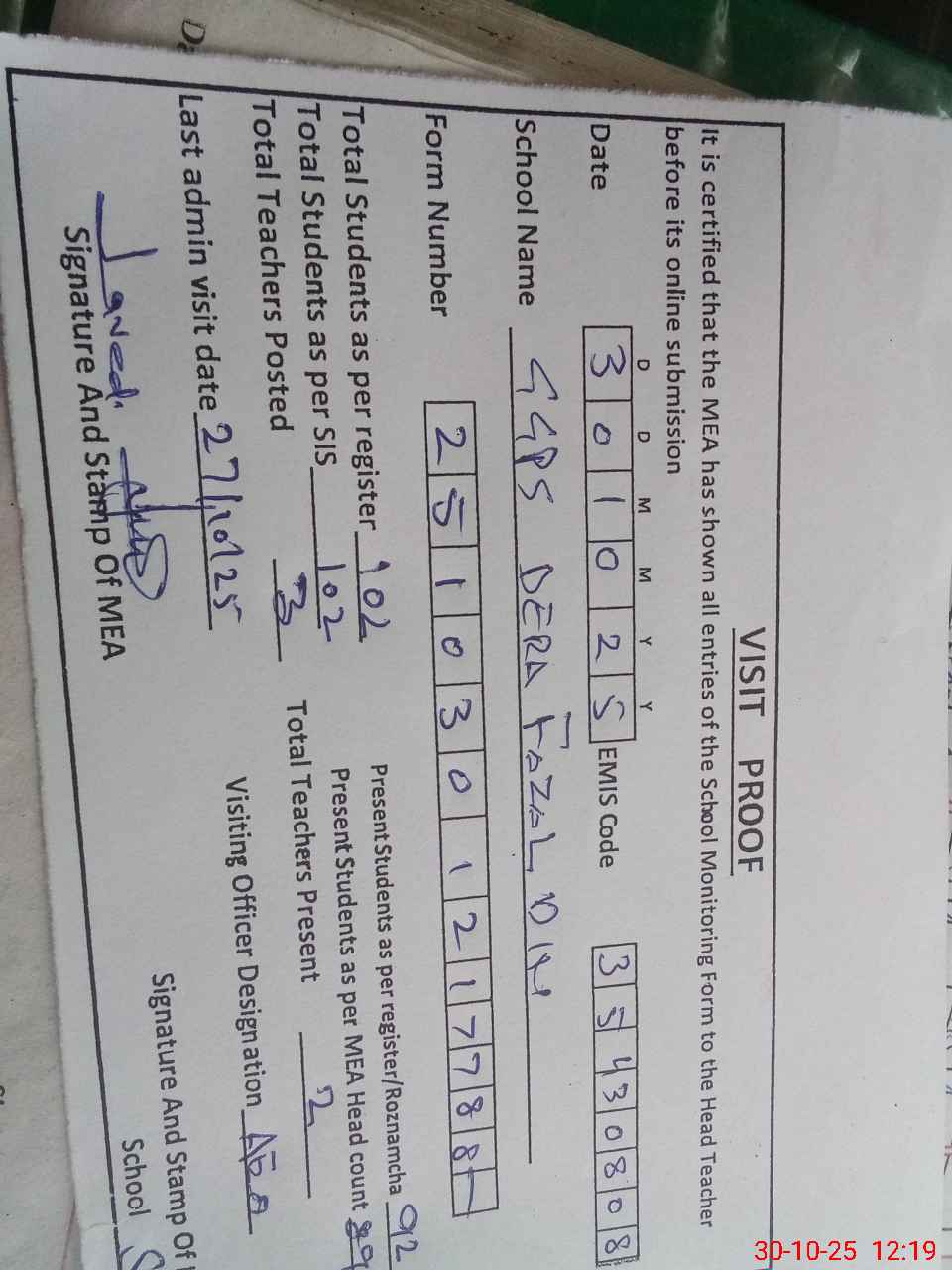 | EMIS Code: 35430808 | Name of School: GGPS DERA FAZAL DIN | |||
