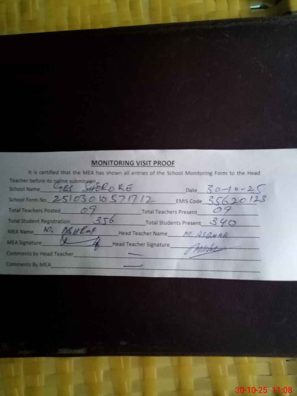 | Attendance Register | Head Teacher | MEA with School | Visit Proof |