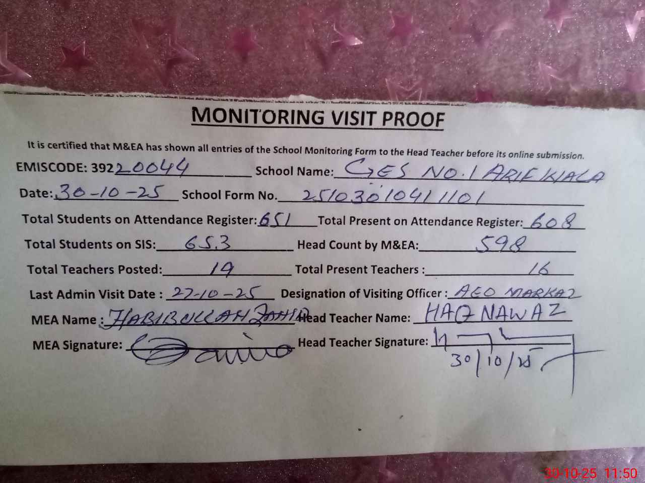 | EMIS Code: 39220044 | Name of School: GES NO. 1 ARIF WALA | |||