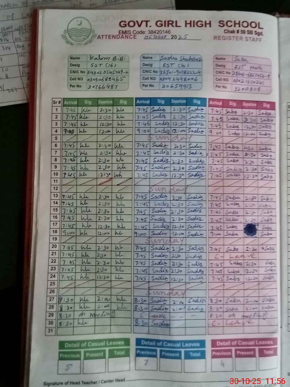 | CNIC | Full Name | Designation | R/C | Absence During Last Calender Month |