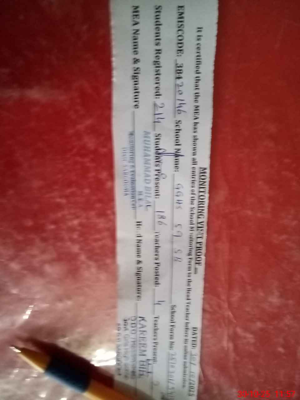 | Attendance Register | Head Teacher | MEA with School | Visit Proof |