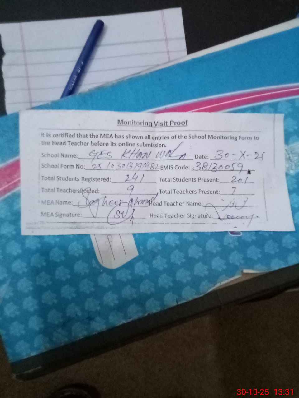 | Attendance Register | Head Teacher | MEA with School | Visit Proof |