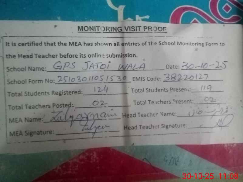 | EMIS Code: 38220127 | Name of School: GPS JATOI WALA | |||