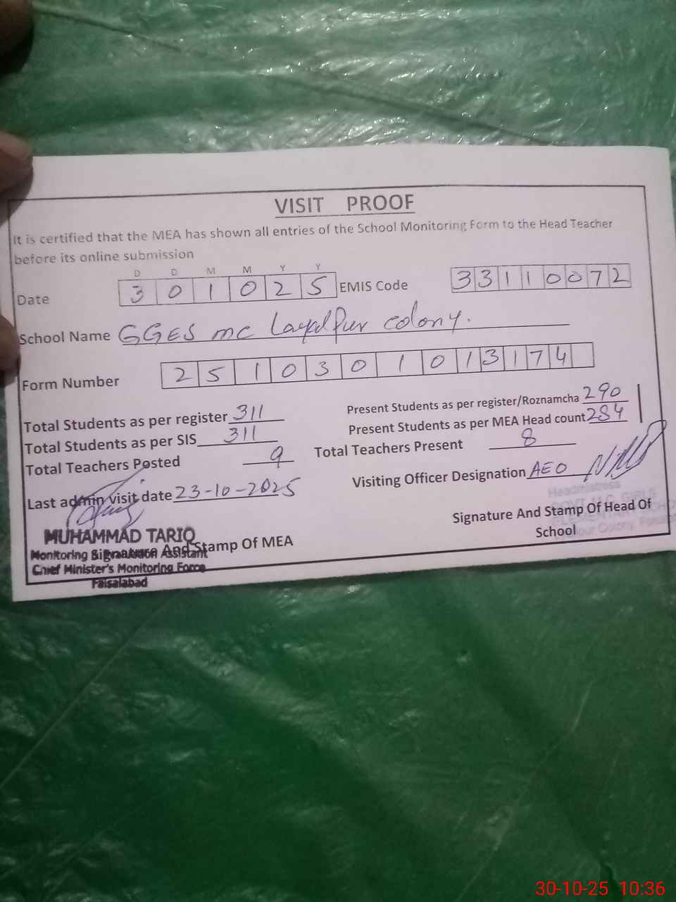 | Attendance Register | Head Teacher | MEA with School | Visit Proof |