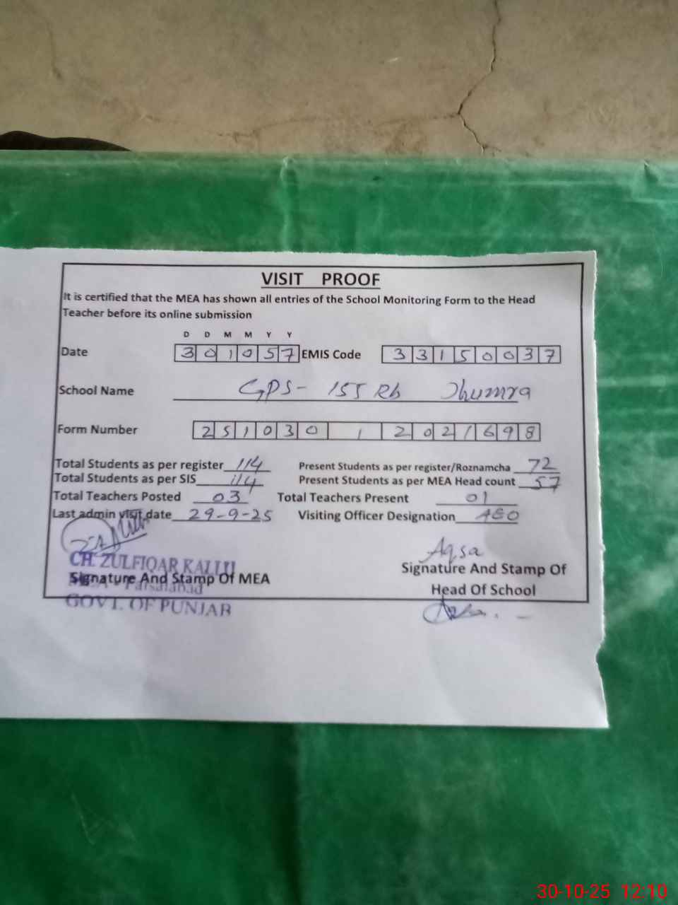 | Attendance Register | Head Teacher | MEA with School | Visit Proof |