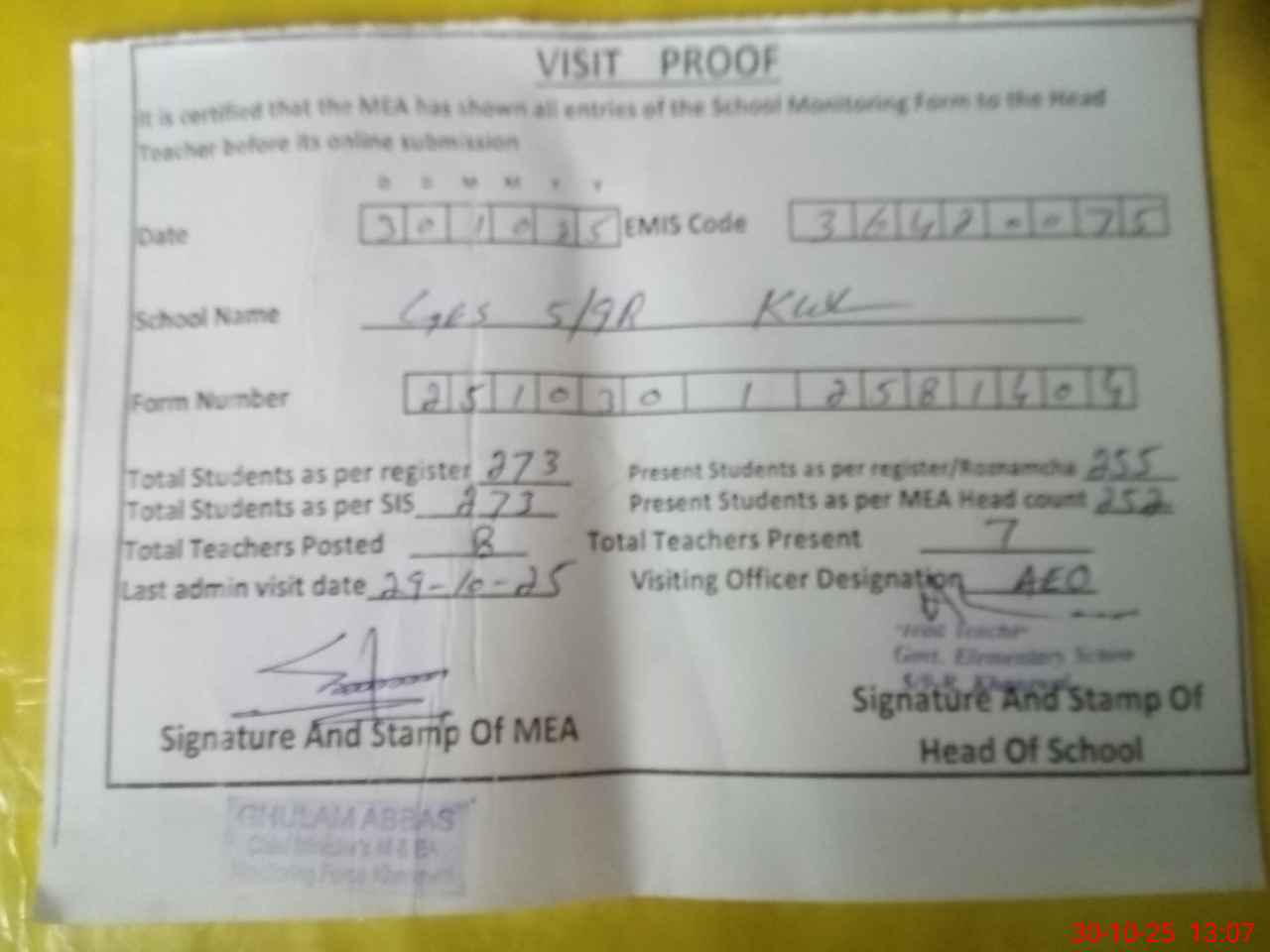 | EMIS Code: 36420075 | Name of School: GES 5/9-R YAROWALA, KACHA KHUH | |||