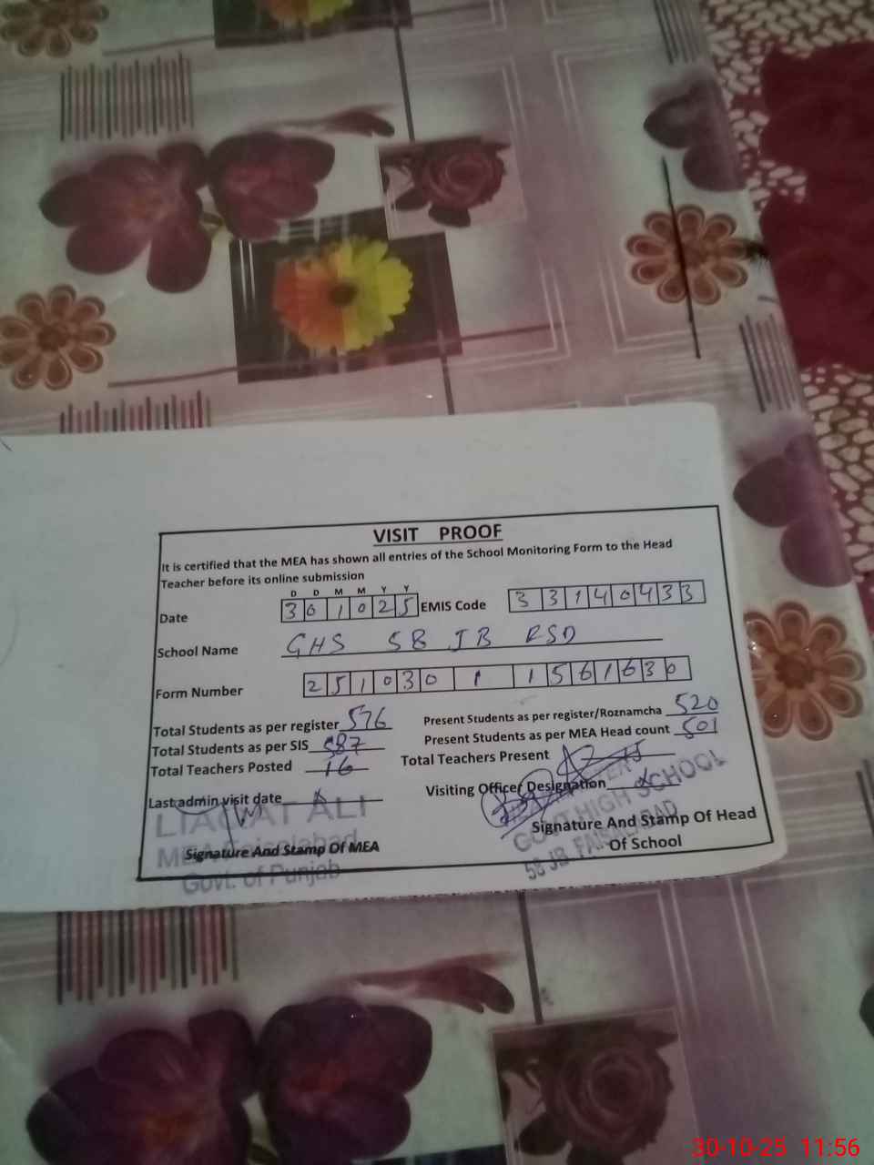 | Attendance Register | Head Teacher | MEA with School | Visit Proof |