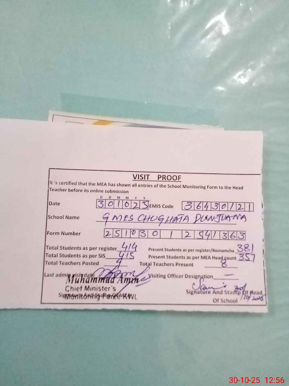 | Attendance Register | Head Teacher | MEA with School | Visit Proof |