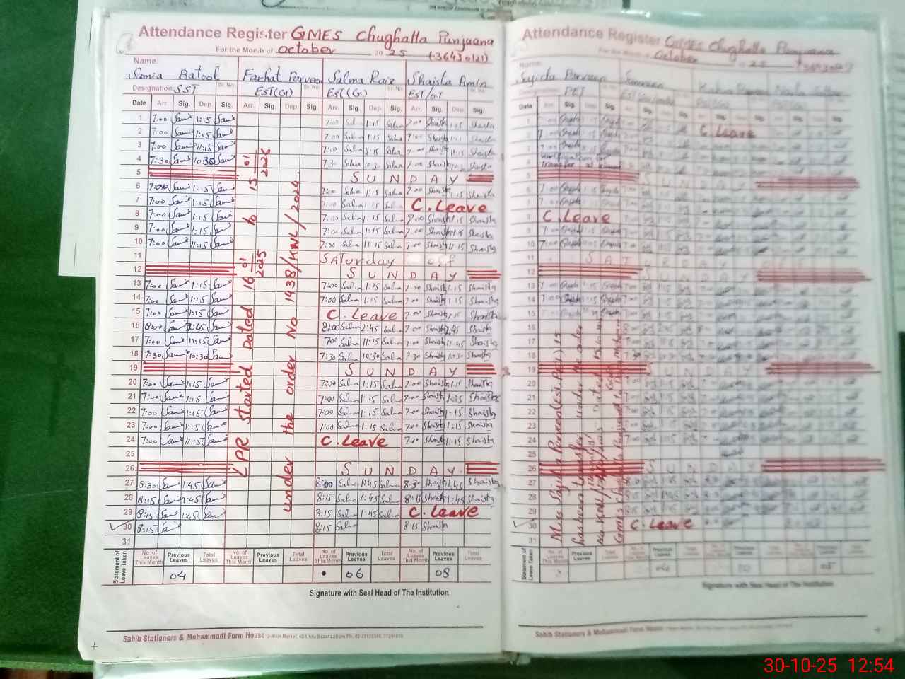 | CNIC | Full Name | Designation | R/C | Absence During Last Calender Month |