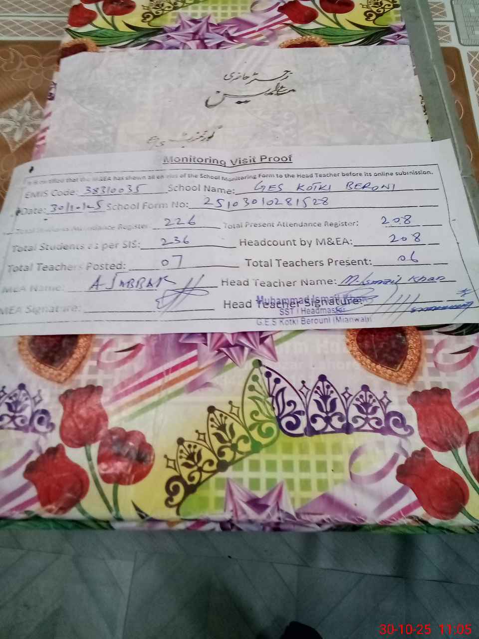 | Total no. of Classrooms: 8 No. of Classrooms Used for Teaching: 8 No. of Classrooms Storing Old Furniture, FTBs, etc: 0Comments if Any: Students enrolled 226 present 208 last visit by Aeo 20 Oct 25 no nsb record maintained in cash book no ftf record |