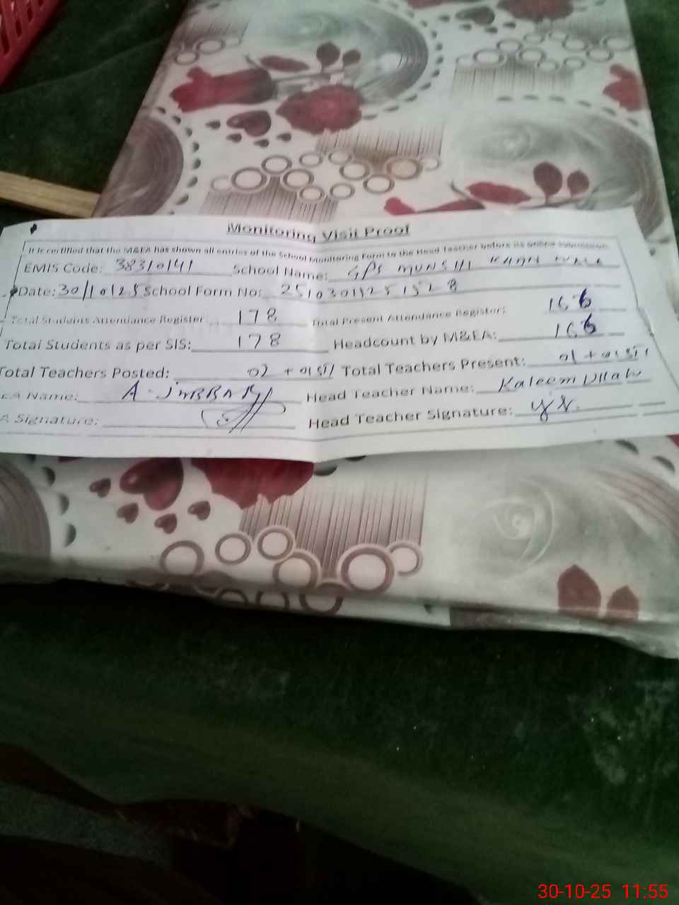 | Total no. of Classrooms: 6 No. of Classrooms Used for Teaching: 4 No. of Classrooms Storing Old Furniture, FTBs, etc: 0Comments if Any: No nsb record no ftf record students enrolled 178 present 166 last visit by Aeo 20 Oct 25 no D3 form available |