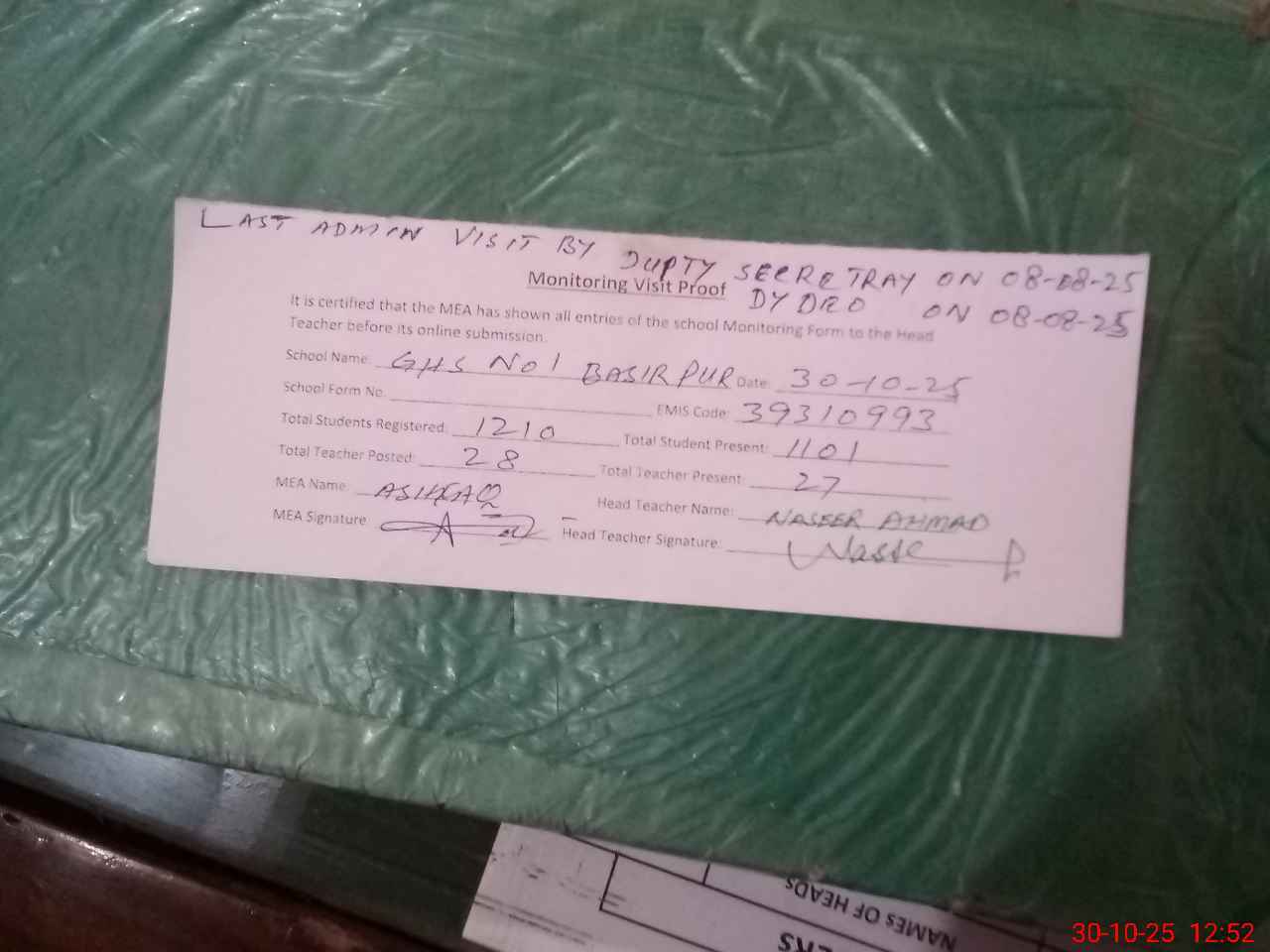 | Remarks (Use Separate Page if Required): Last Administration Visit By Dy secretary on 08 Aug 2025 and Dy DEO On 08 Aug 2025 | |||||
