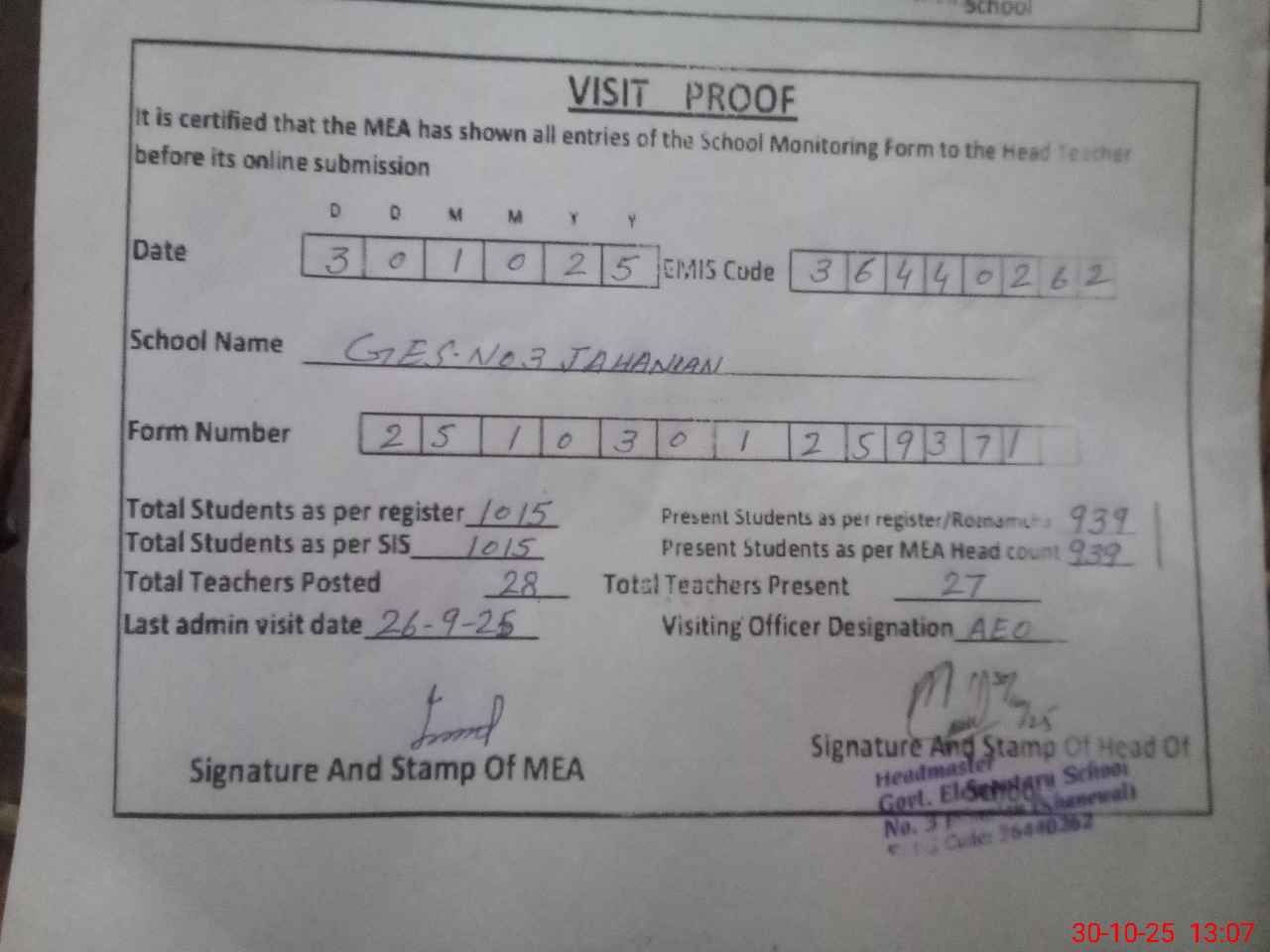 | Certified that this School was Inspected by the Undersigned MEA/DMO Today and the Information Stated Above is as Per Record. | |||||