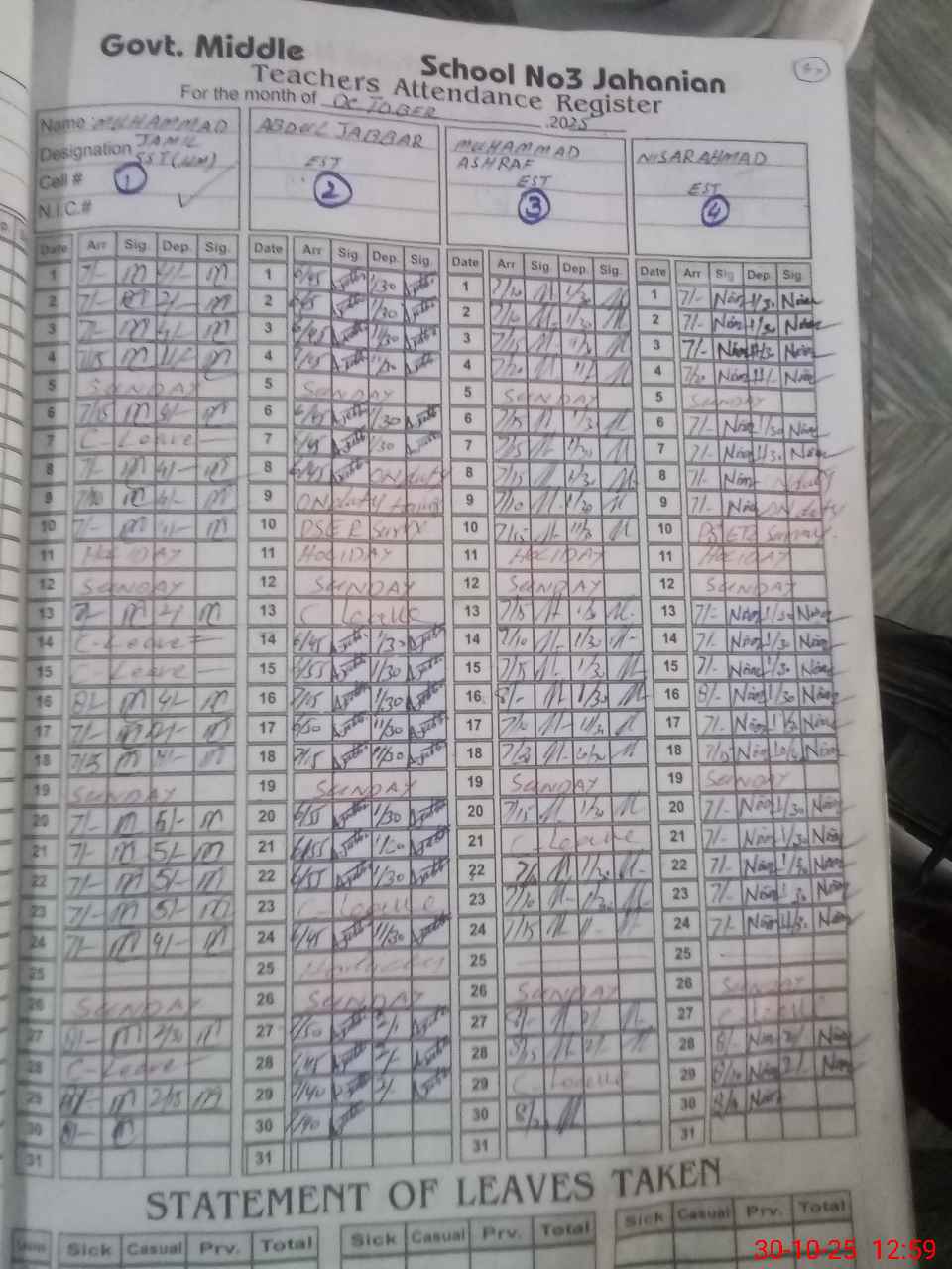 | 36**** | Mi**** Za**** Ma**** Al**** | CHOWKIDAR | Regular | 0 | 0 | 30 | 0 | 0 | 0 | 0 | 0 | 0 | Absent (Un-Authorized) |