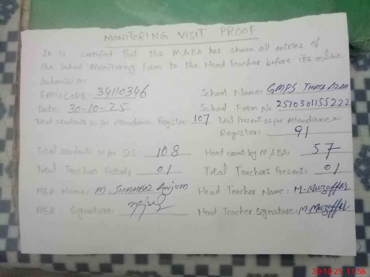 | EMIS Code: 34110346 | Name of School: GMPS THATHA AZAM | |||