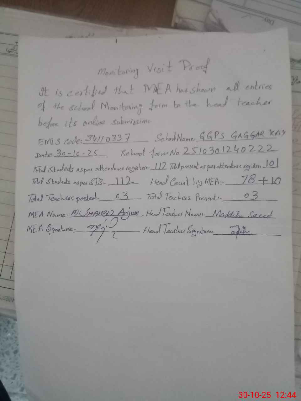| Attendance Register | Head Teacher | MEA with School | Visit Proof |
