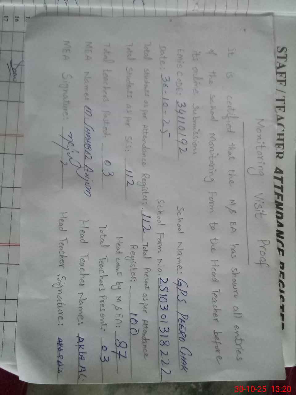 | Attendance Register | Head Teacher | MEA with School | Visit Proof |