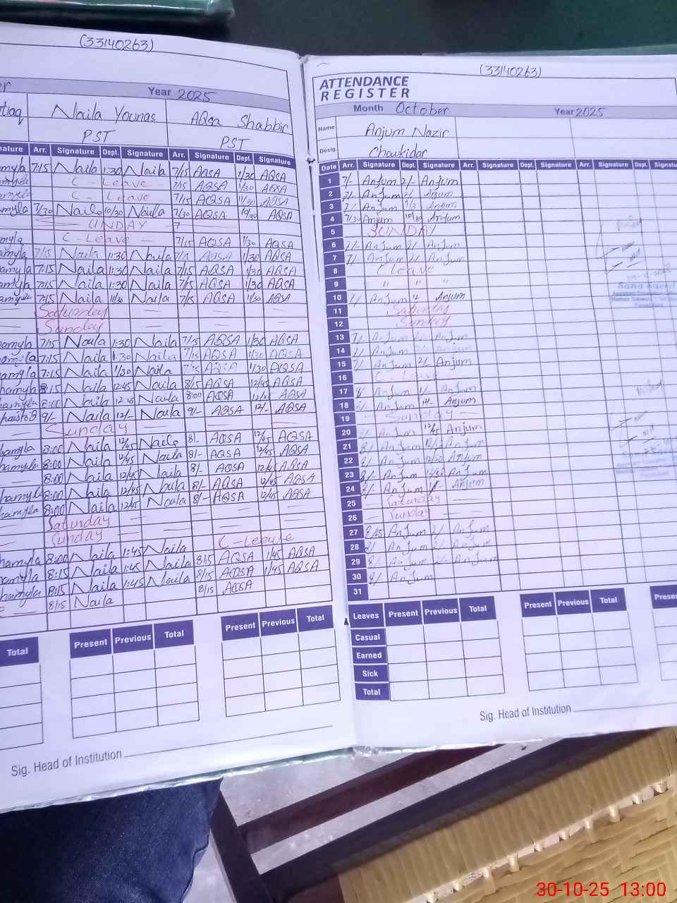 | CNIC | Full Name | Designation | R/C | Absence During Last Calender Month |