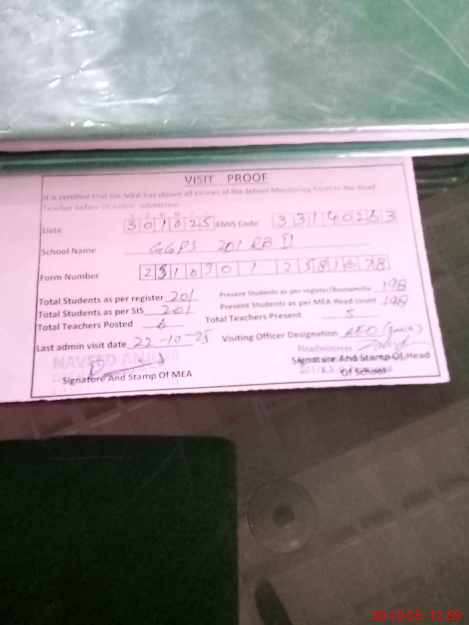 | Certified that this School was Inspected by the Undersigned MEA/DMO Today and the Information Stated Above is as Per Record. | |||||