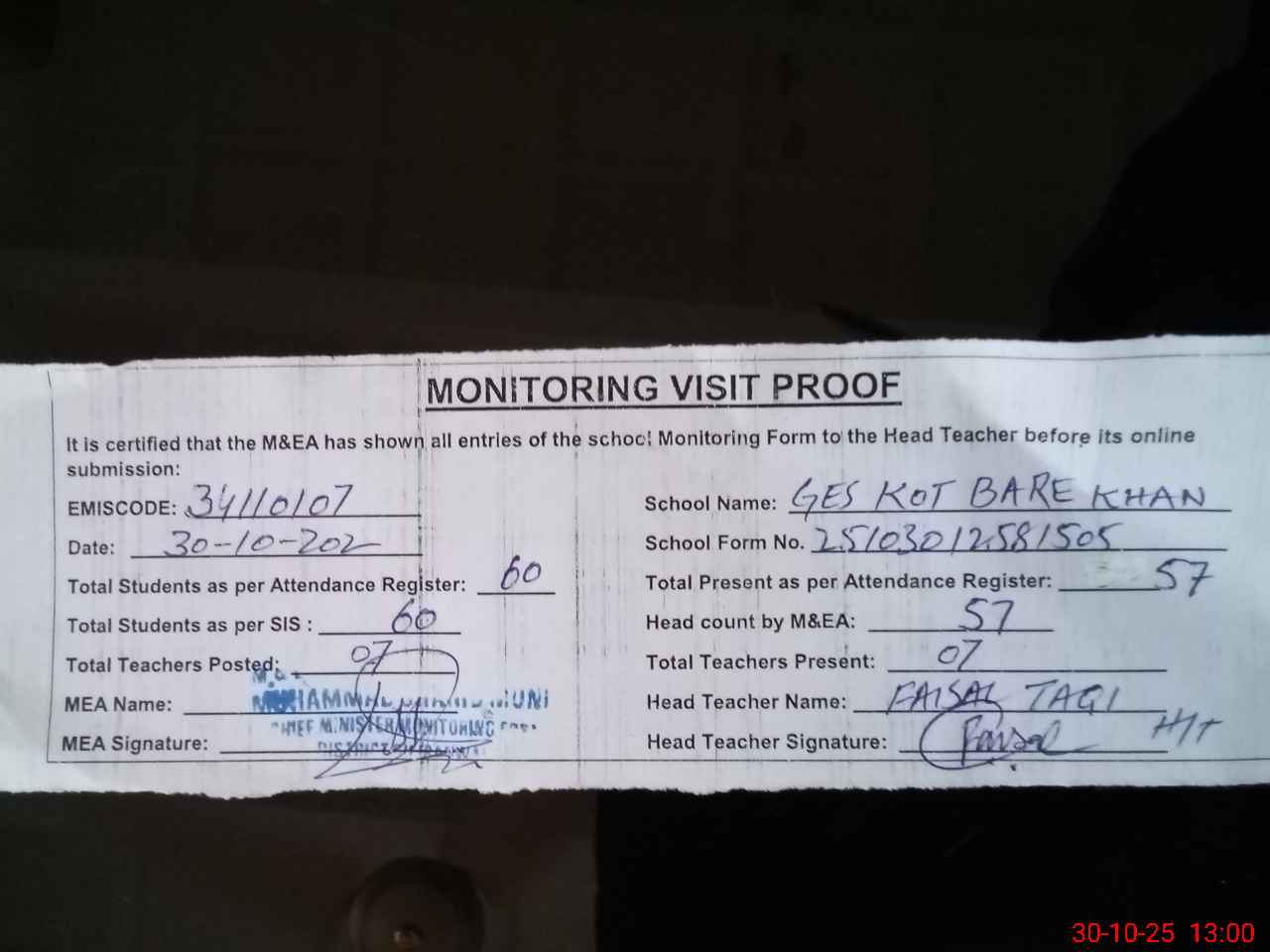 | Attendance Register | Head Teacher | MEA with School | Visit Proof |
