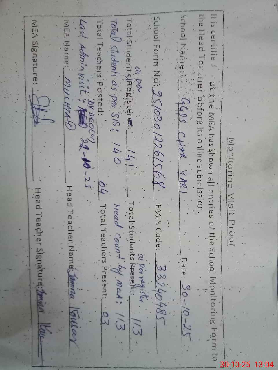 | Attendance Register | Head Teacher | MEA with School | Visit Proof |