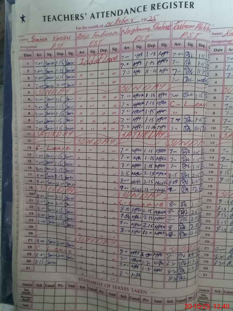 | Leave | Duty | Absent | Maternity | Medical | Ex- Pak |