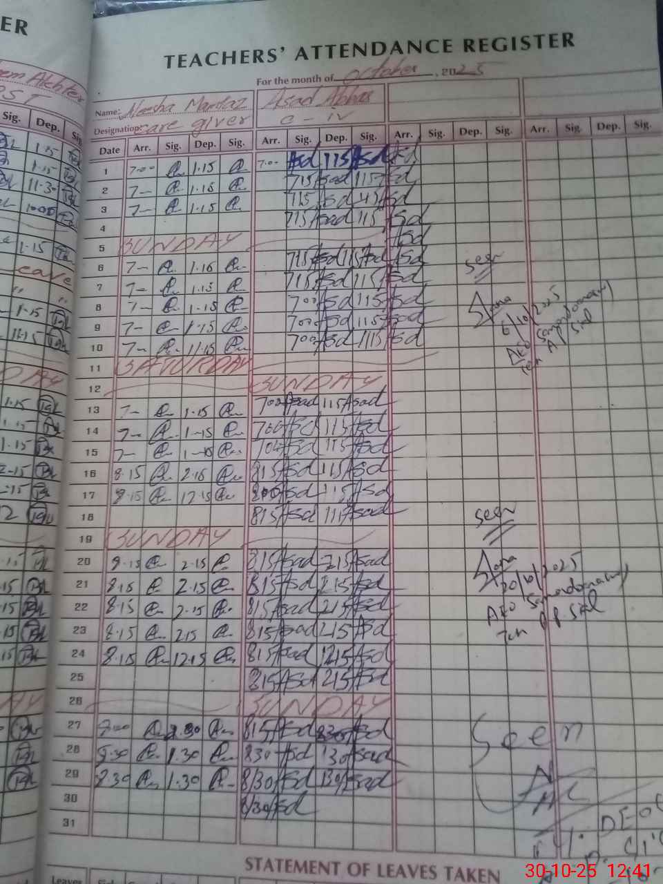 | CNIC | Full Name | Designation | R/C | Absence During Last Calender Month |