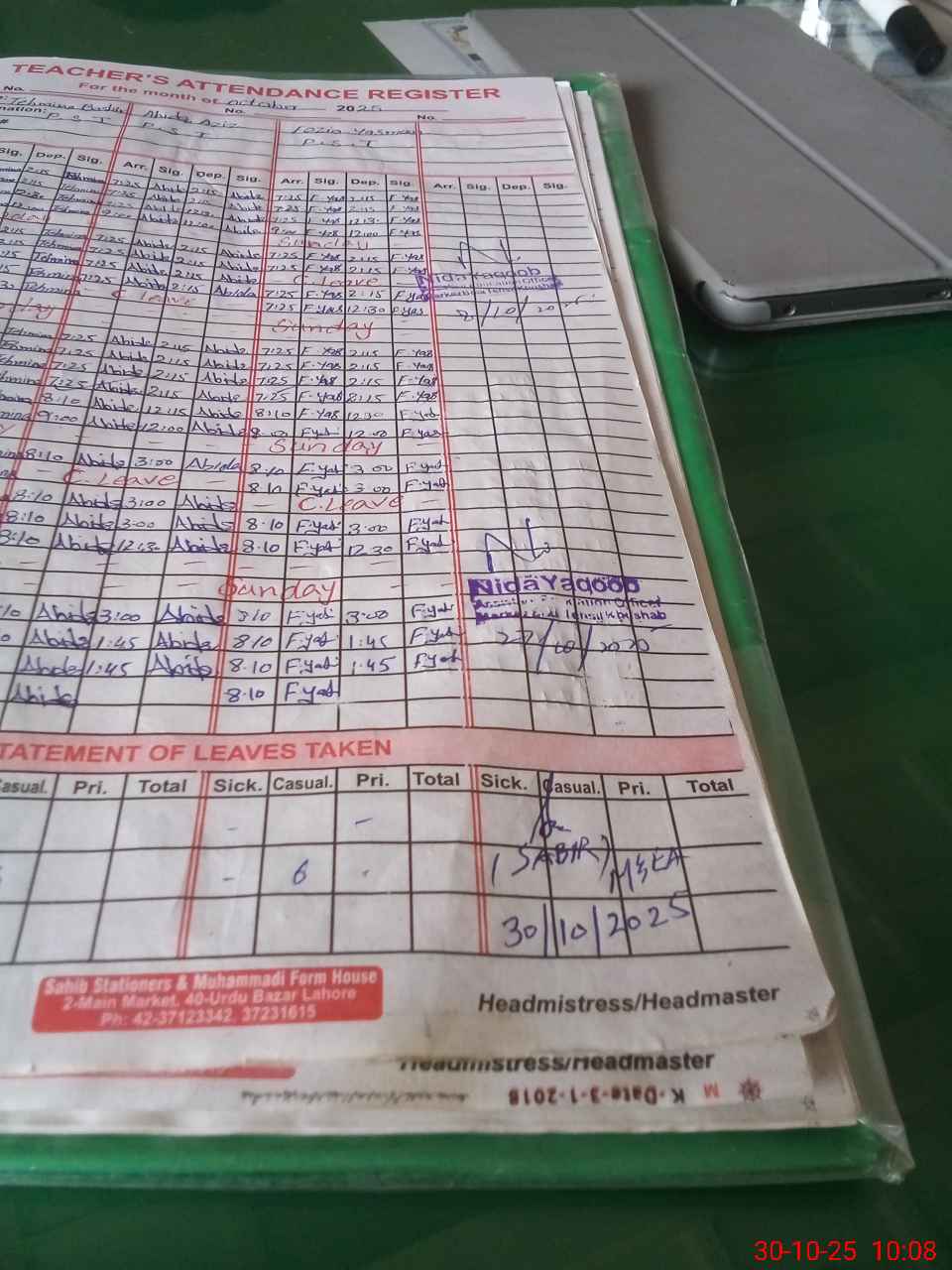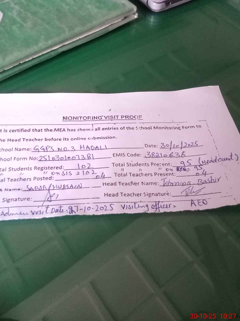 | Remarks (Use Separate Page if Required): 1 No teacher absent 2 Last admin visit by AEO on 27 Oct 2025 | |||||