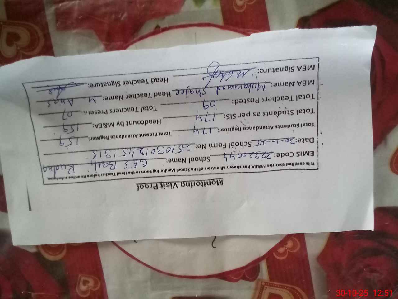 | Certified that this School was Inspected by the Undersigned MEA/DMO Today and the Information Stated Above is as Per Record. | |||||