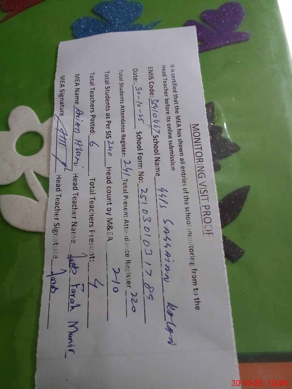 | Attendance Register | Head Teacher | MEA with School | Visit Proof |