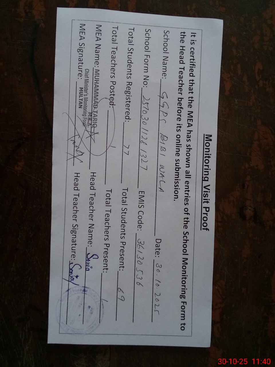 | Certified that this School was Inspected by the Undersigned MEA/DMO Today and the Information Stated Above is as Per Record. | |||||