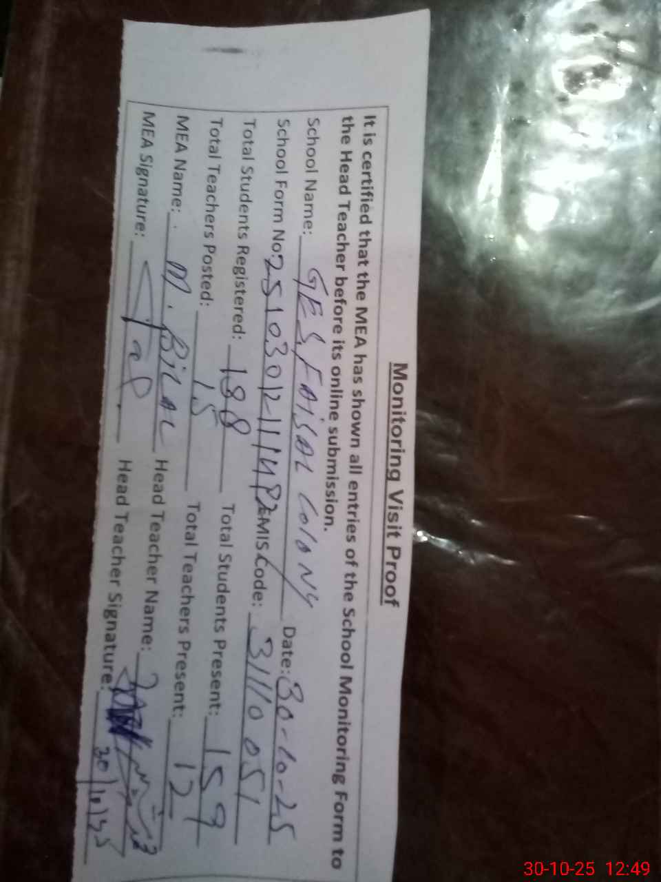 | EMIS Code: 31110051 | Name of School: GES FAISAL COLONY | |||