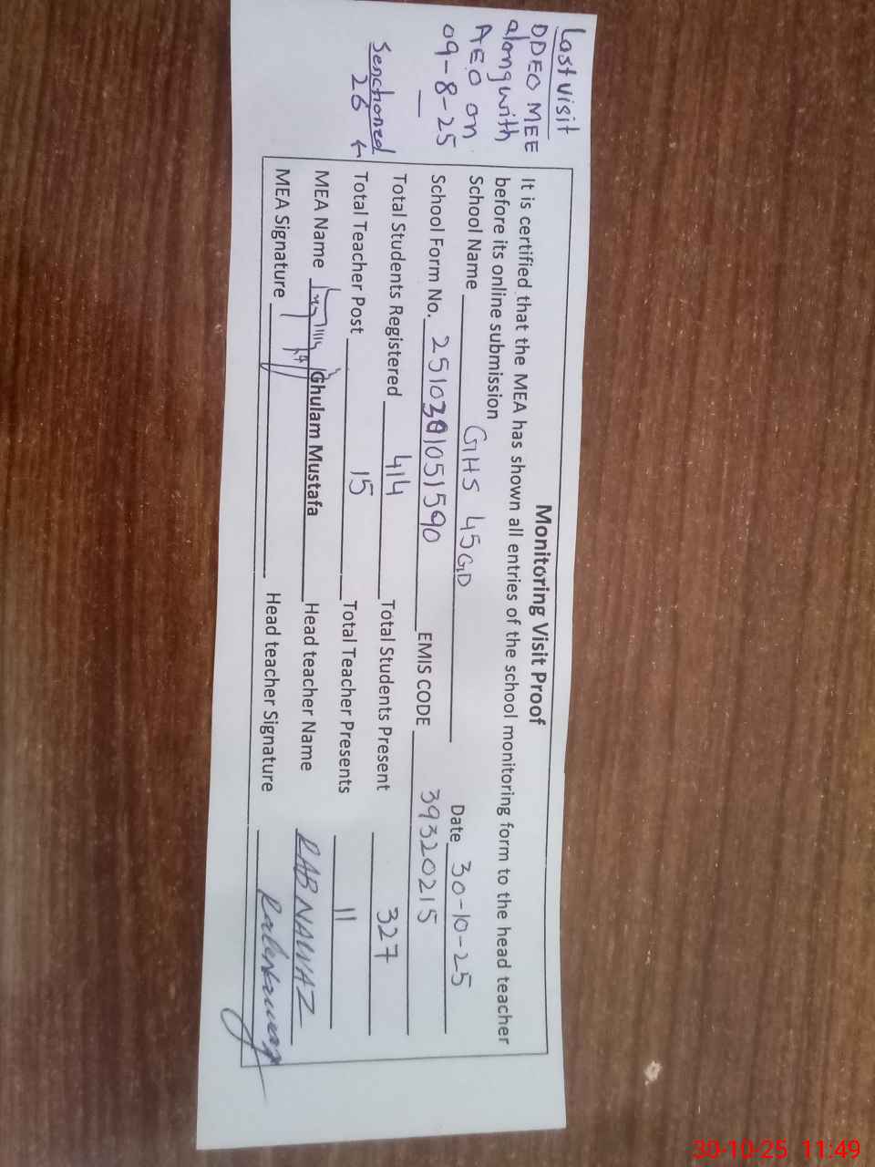 | Remarks (Use Separate Page if Required): Last Visit DDEO MEE along with AEO on 09 August 2025 for verification of missing boundary walls etc Teacher Hafiz Shujaat Ahmad ESE SCIENCE absented himself from duty since 8th May 2025 Enrollment of the students found according to SIS ie 414 Sanctioned vacancies of teaching staff is 26 but posted strength of teaching staff is 15 vacant post are about 11 Submitted for information please | |||||