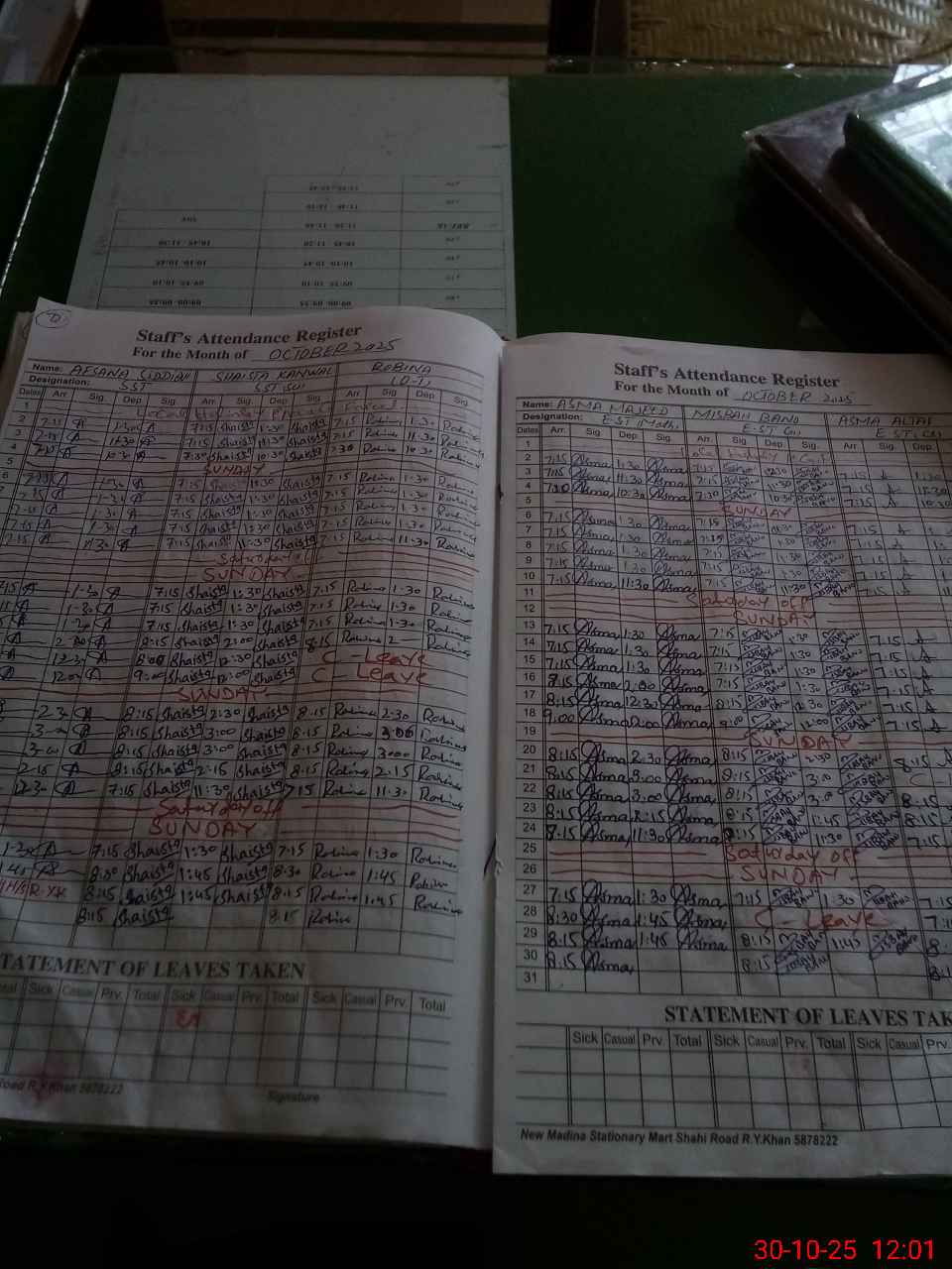 | CNIC | Full Name | Designation | R/C | Absence During Last Calender Month |