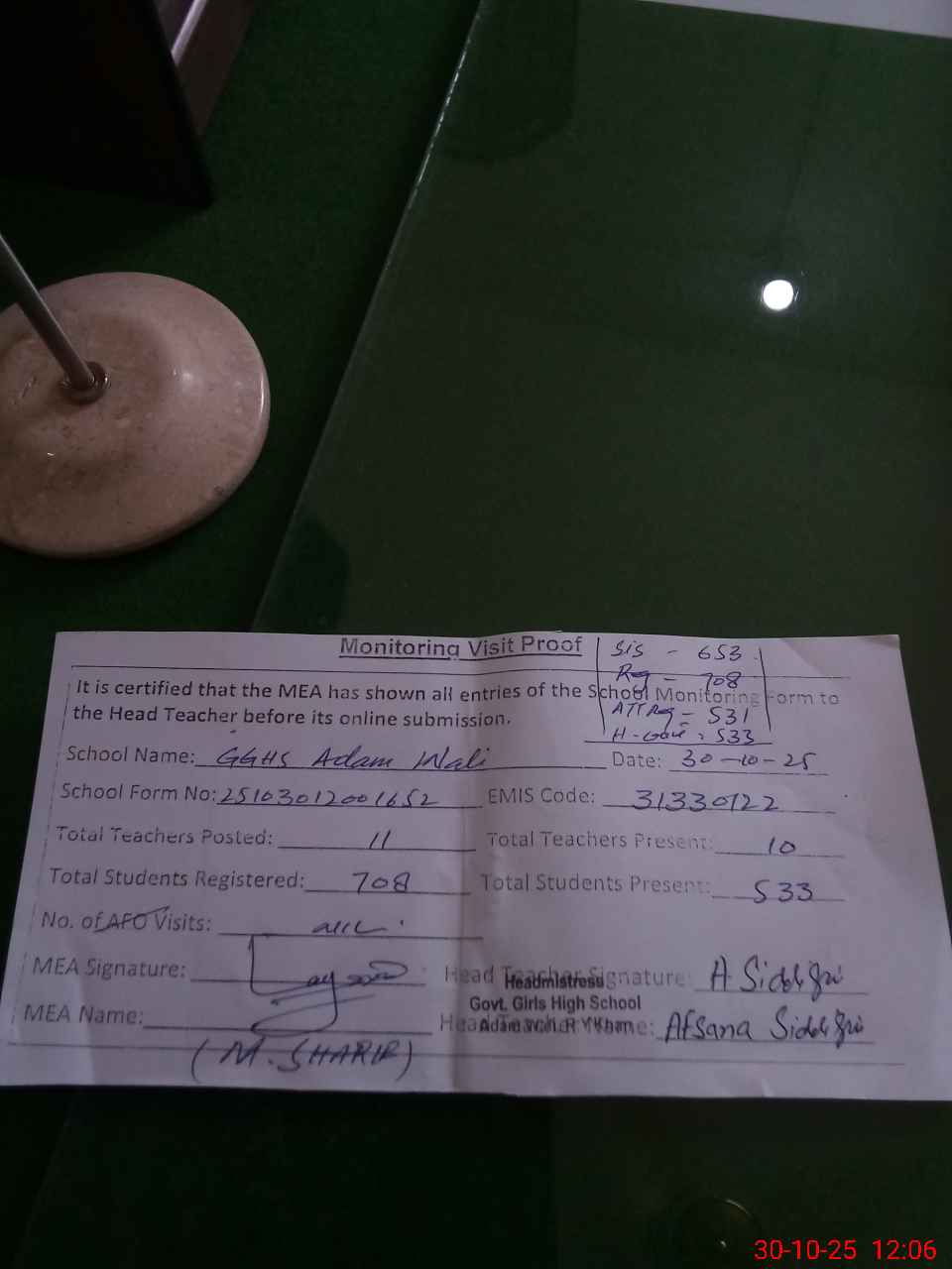 | Attendance Register | Head Teacher | MEA with School | Visit Proof |