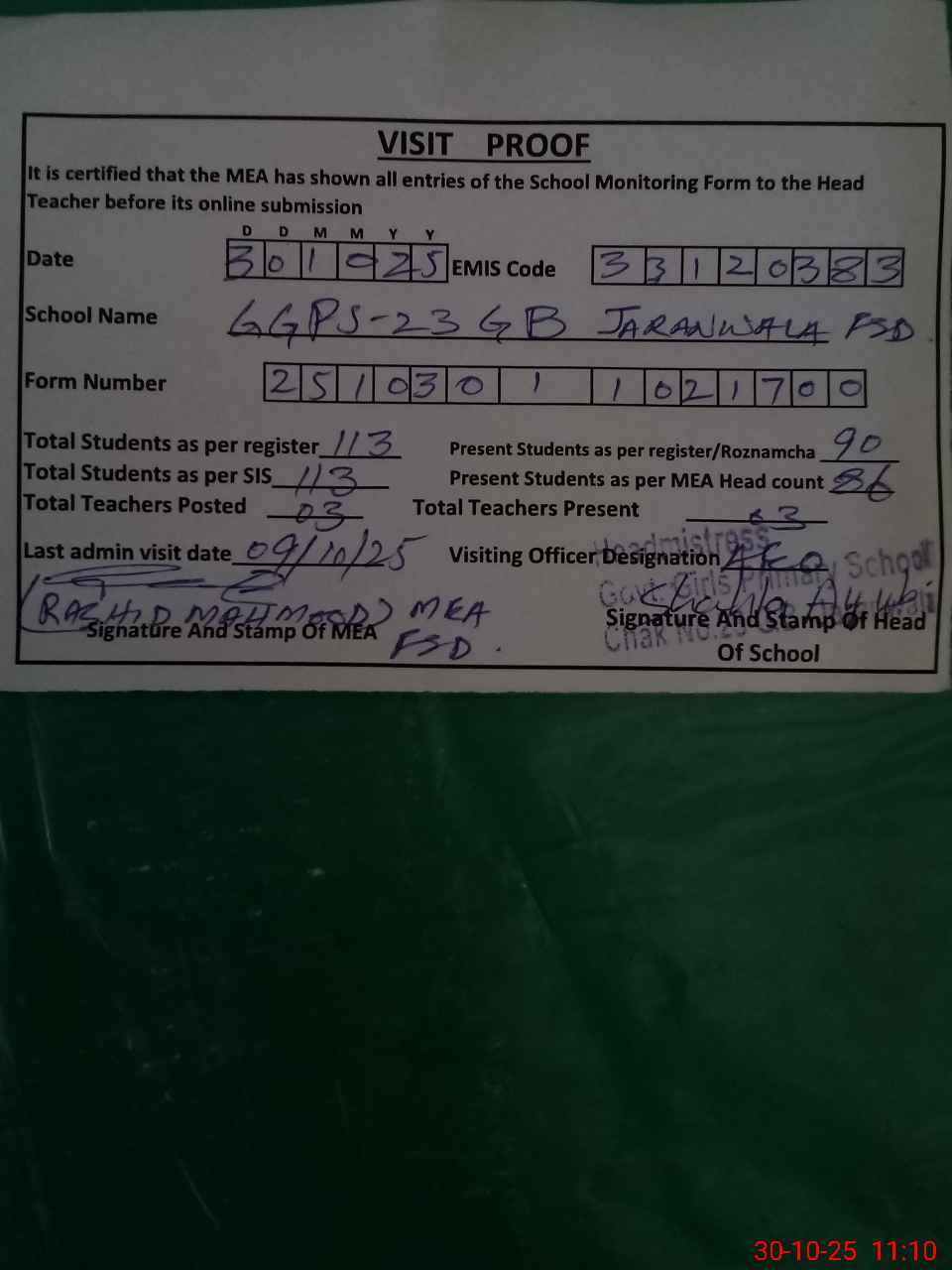 | EMIS Code: 33120383 | Name of School: GGPS CHAK 23 GB JARANWALA | |||