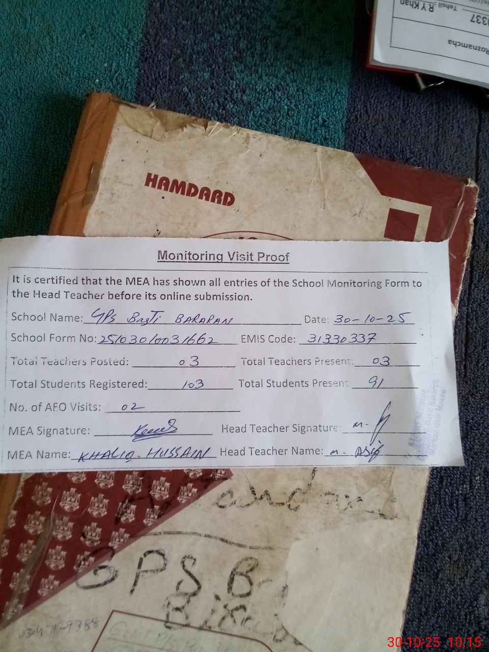 | Monitoring Date: 30-10-2025 | Start Time: 30-10-2025 09:41 AM | End Time: 30-10-2025 10:15 AM | Name of MEA: Kh**** Hu**** | |