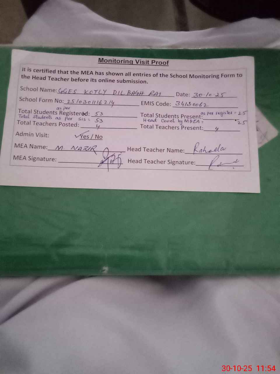 | Attendance Register | Head Teacher | MEA with School | Visit Proof |