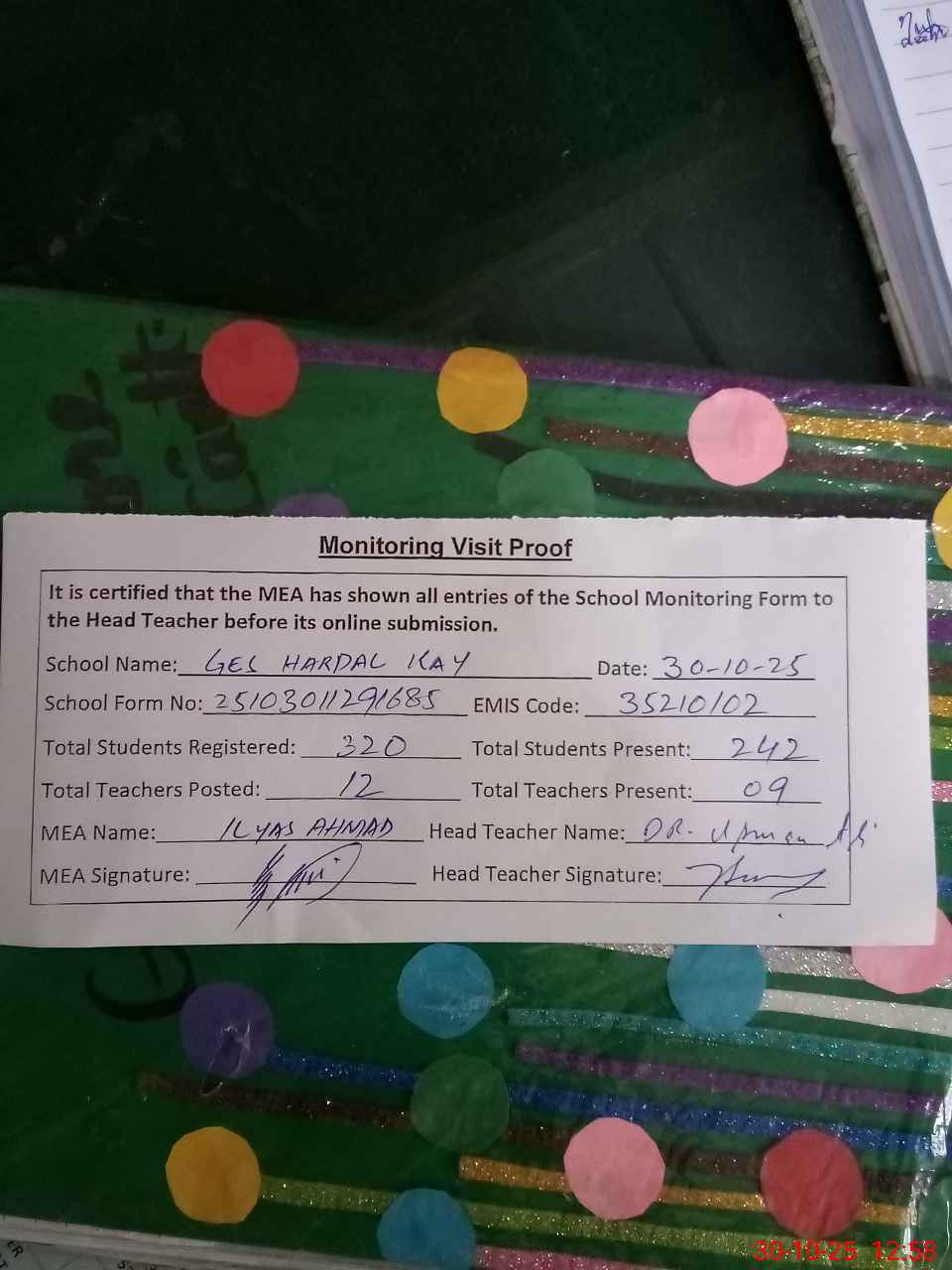 | Attendance Register | Head Teacher | MEA with School | Visit Proof |