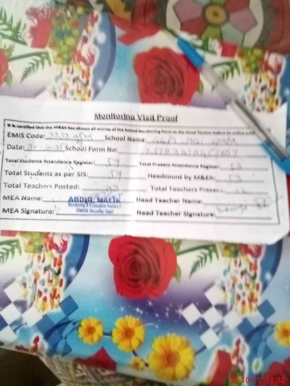 | Attendance Register | Head Teacher | MEA with School | Visit Proof |