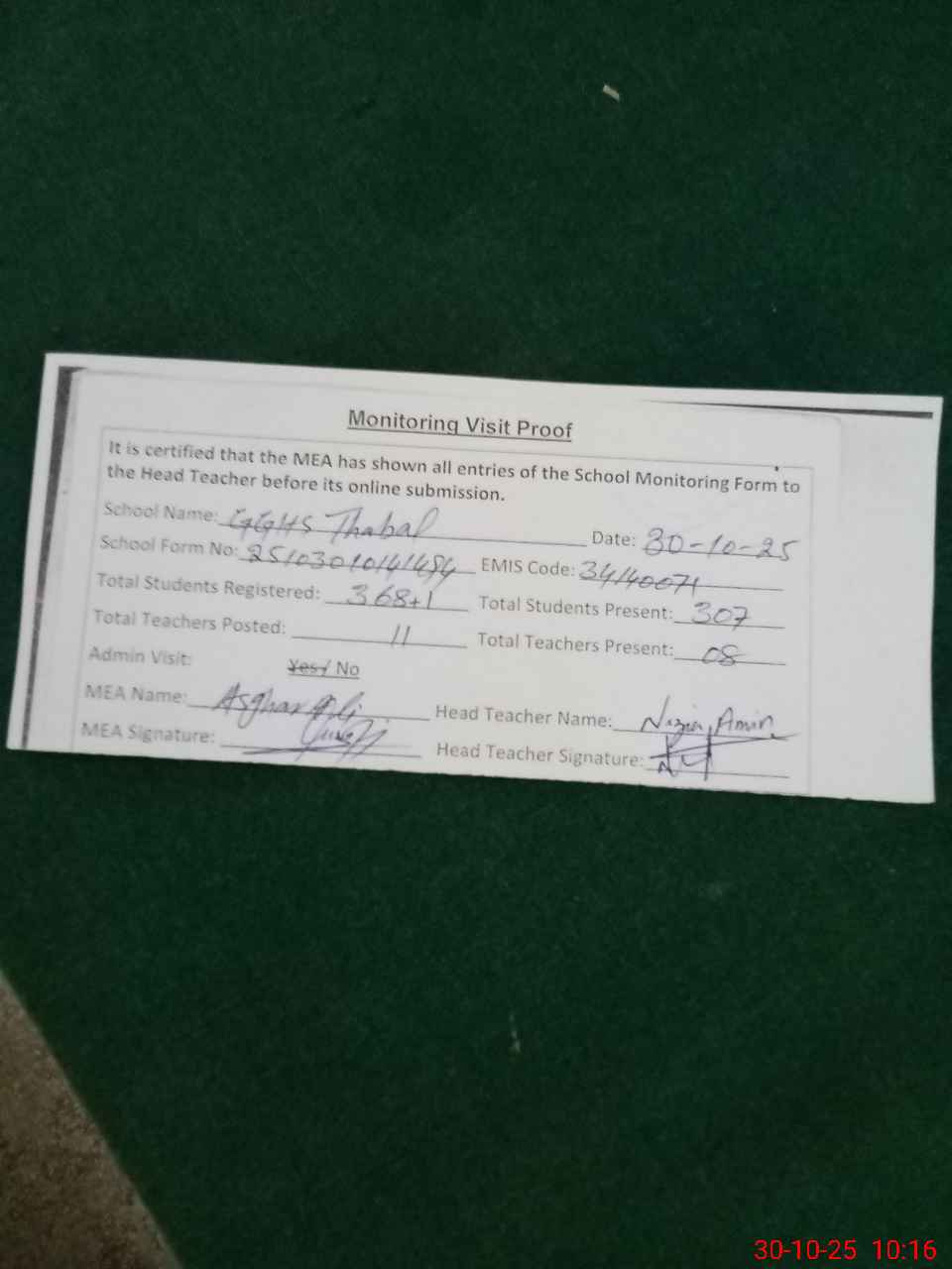 | Monitoring Date: 30-10-2025 | Start Time: 30-10-2025 09:00 AM | End Time: 30-10-2025 10:19 AM | Name of MEA: N-**** Al**** | |