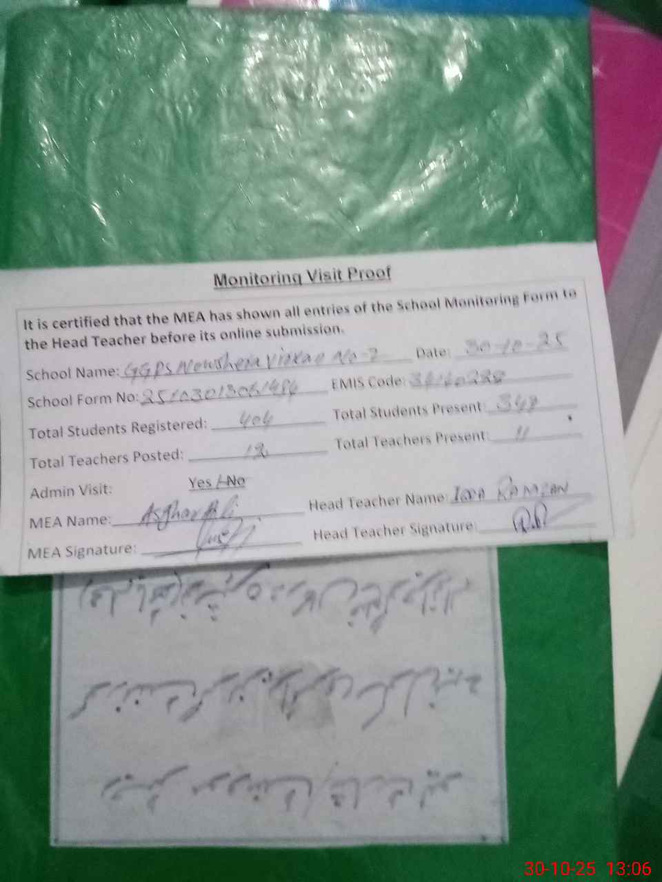 | Attendance Register | Head Teacher | MEA with School | Visit Proof |