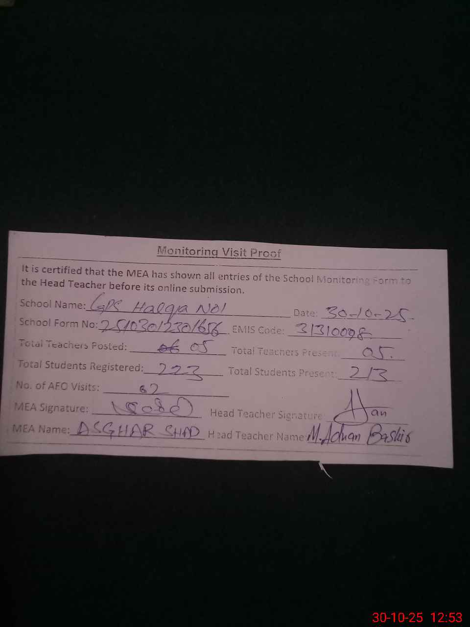 | EMIS Code: 31310098 | Name of School: GPS MC HALQA NO 1 | |||