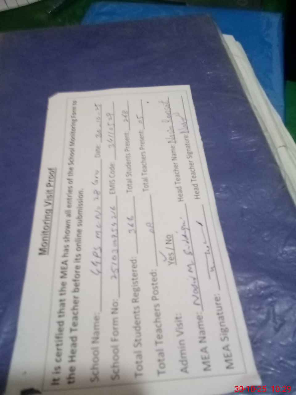 | Attendance Register | Head Teacher | MEA with School | Visit Proof |