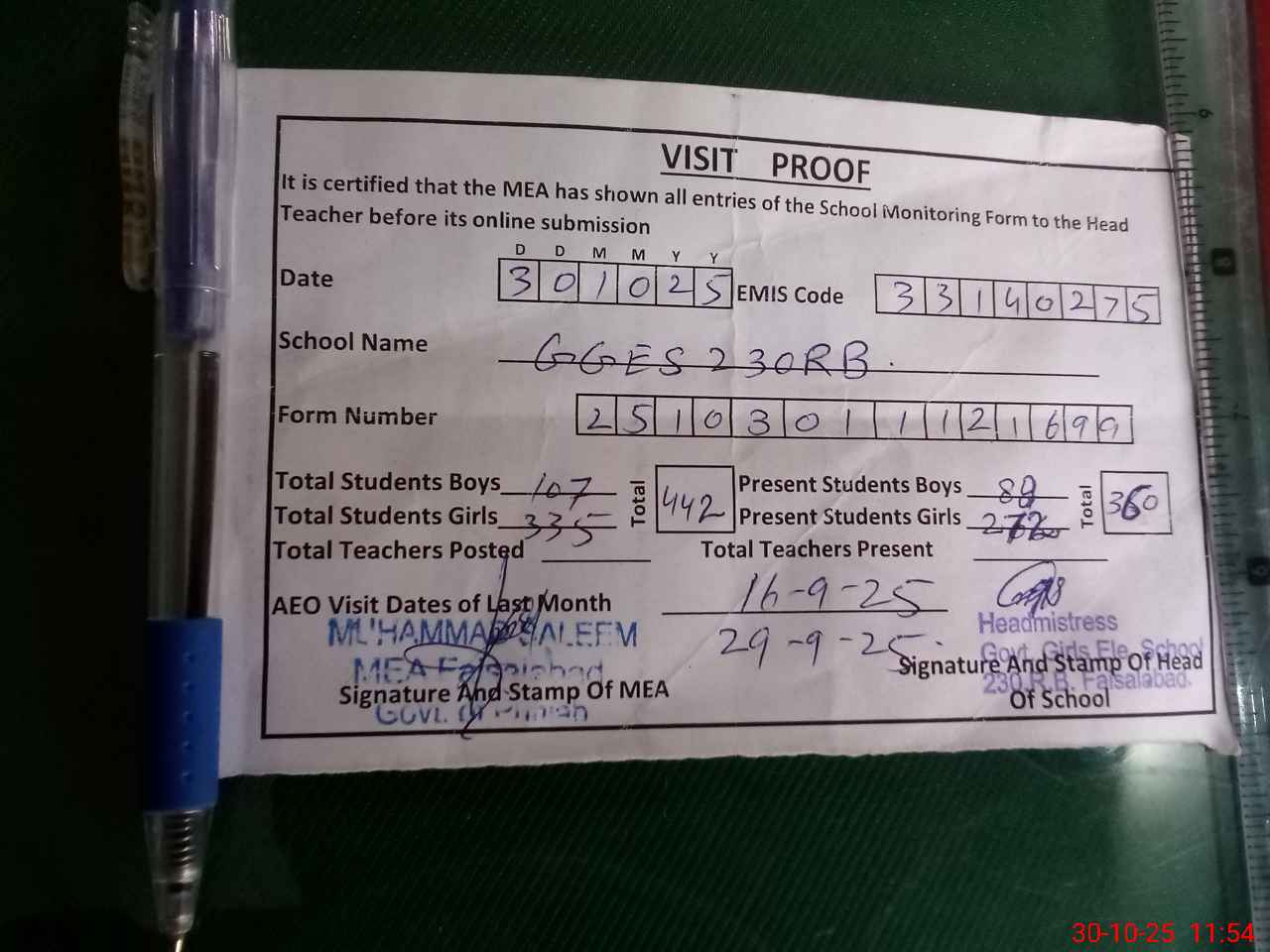| Attendance Register | Head Teacher | MEA with School | Visit Proof |
