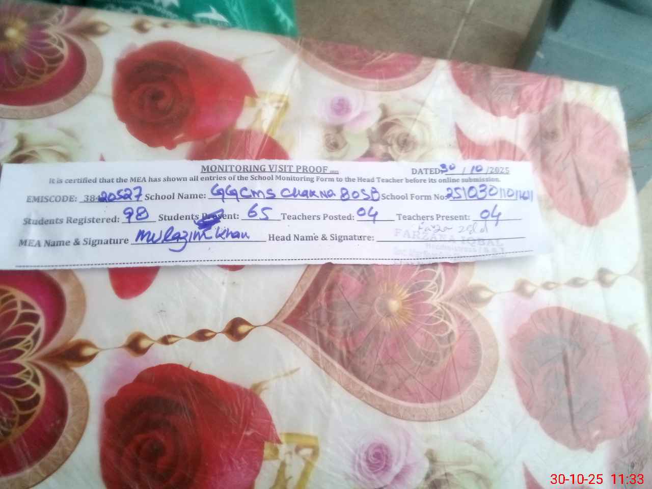 | Attendance Register | Head Teacher | MEA with School | Visit Proof |
